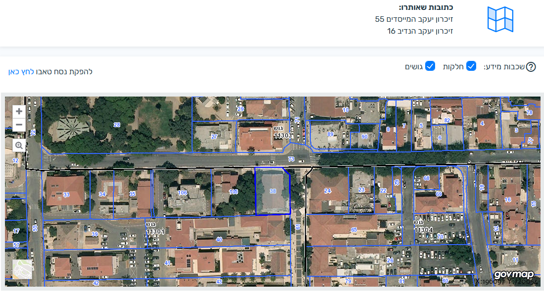 המשכתי בבדיקה שלי ולהלן נתונים נוספים כולל מראה מקום איתור גוש 11301 חלקה 38 של בית הכנסת ( נעזרתי ב GovMap( ובסמוך אליה עובר קו החלקה של בית הלוואה וחסכון בחלקה 105 הסמוכה כך שנדרש לבדוק גבולות ברורים שדל החלקות ביחס לשטח וחצר בית הכנסת ואגודת הלוואה חסכון.