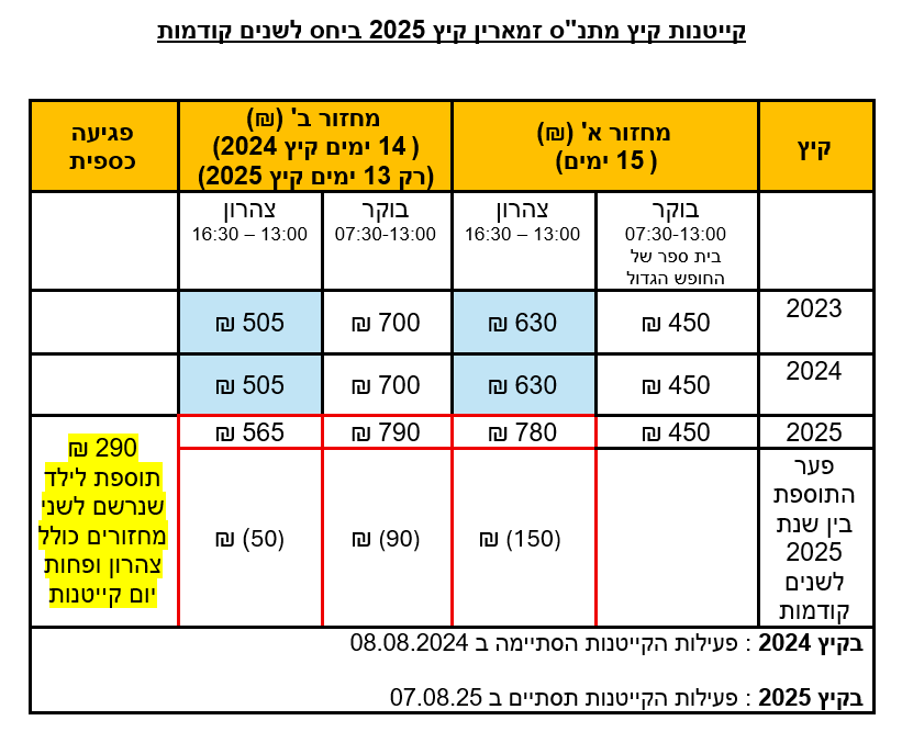 ראו מטה, טבלת השוואה שהכנתי, ופרסומים לרישום לקייטנות משנים עברו.