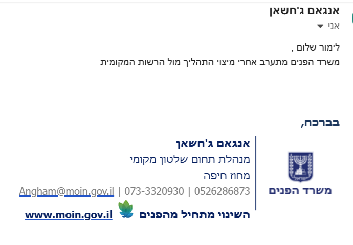 כמובן שפניתי גם לאחראים במשרד הפנים על המועצה. לפי החוק, משרד הפנים האחראי על הרשות אמור לסייע לעבודת חברי האופוזיציה. הוא לא עושה זאת. הנה התשובה האחרונה שקיבלתי מהאחראית במשרד הפנים.