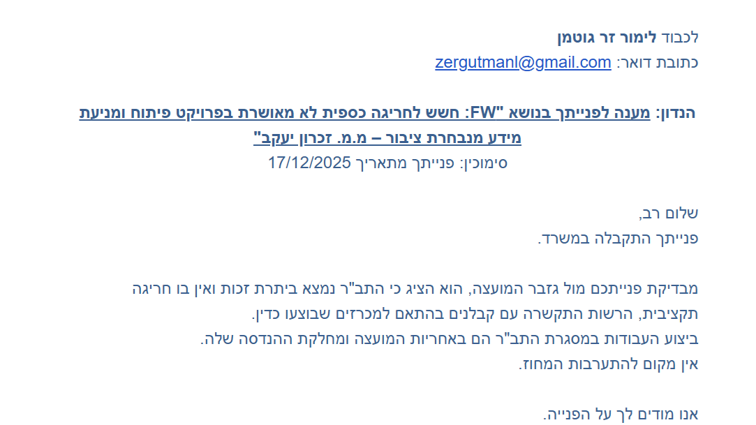 • פניתי אליו במכתב ראשון בחודש פברואר 2025. כמובן שלא טרח לענות.