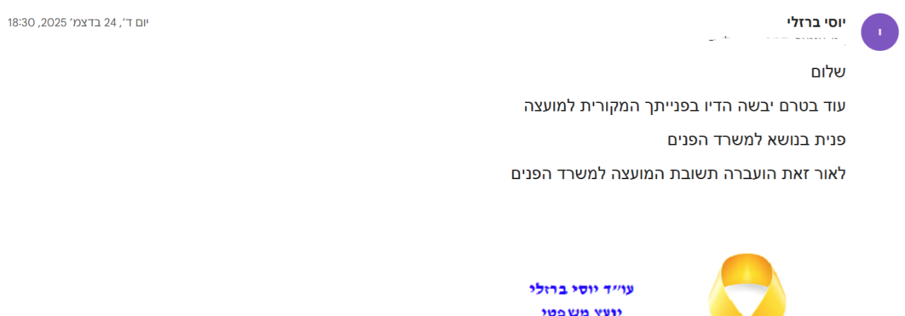• בחודש מרץ 2025 המשכתי ופניתי למשרד המשפטים ומשרד הפנים.