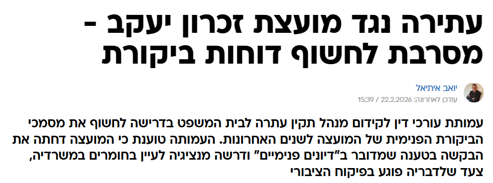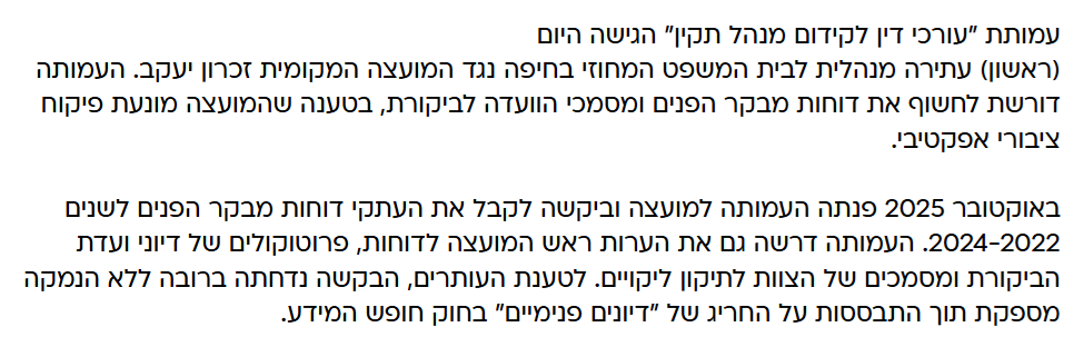 העותרת היא עמותת עורכי דין למינהל תקין איתה הגשתי את העתירה הקודמת נגד המועצה וראש המועצה לעניין פרסום אסור. עתירה בה נצחנו. אני מקווה שהפעם ראש המועצה למד את הלקח ולא יבזבזו כספי ציבור על תשלום למשרד עורכי דין שינסה להתגונן בטענות סרק למול העתירה. הפעם חובה להתנצל ולתקן את האתר בהקדם. מוזמנים לעיין באתרי מידע של רשויות אחרות ולראות כי בהם דוחות מבקר הפנים מפורסמים לציבור. מועצה לא צריכה למנוע ולהיאבק בשקיפות אלא לקדם אותה.